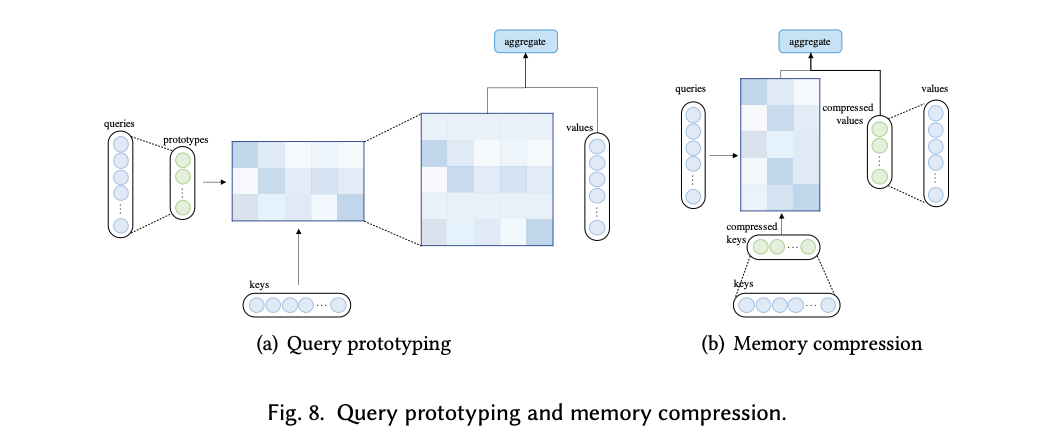 Query prototype & memory compression: attention의 key, query, value memory pair의 수를 줄여 attention matrix 연산을 줄인다.