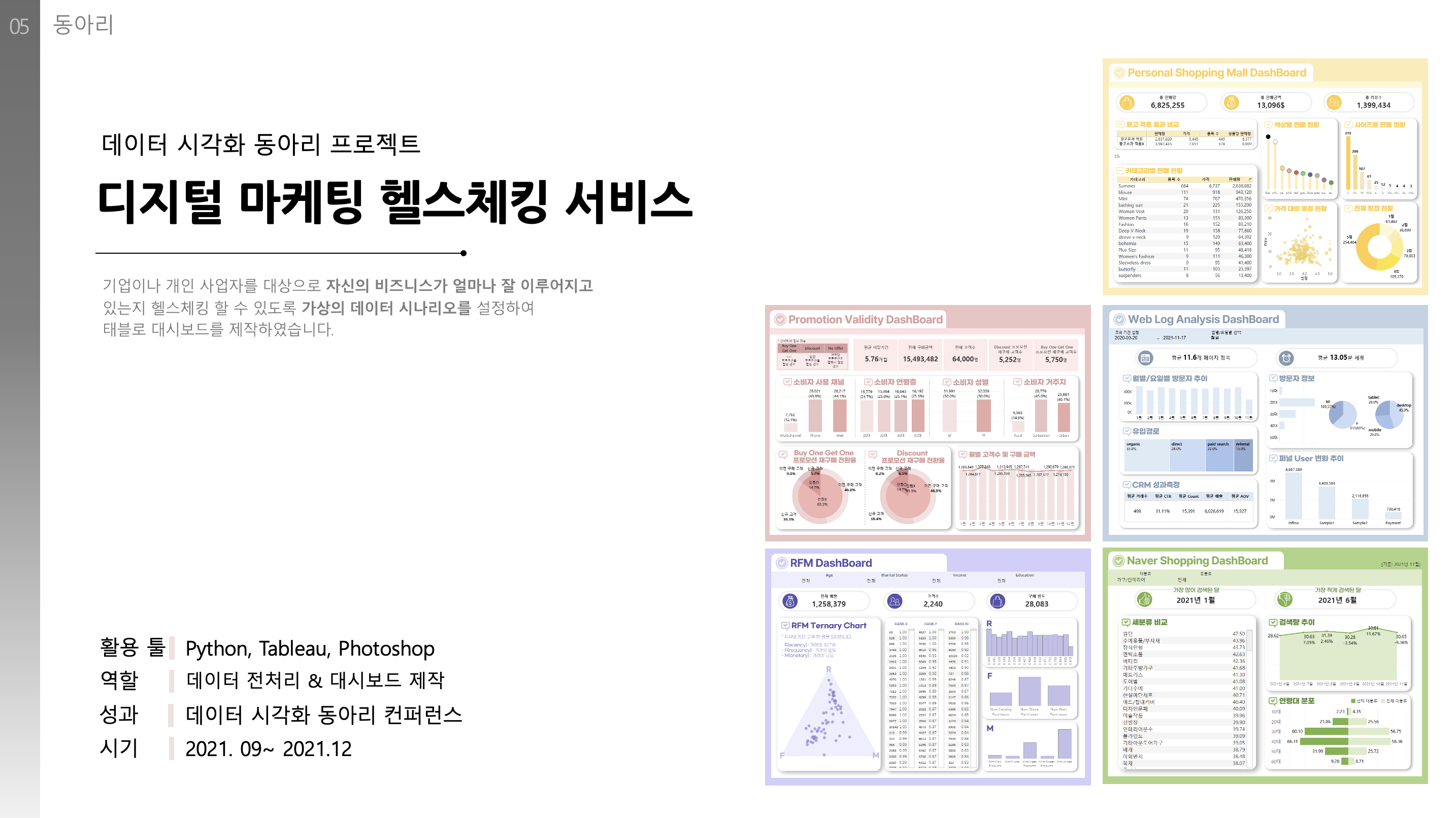- 저는 이 포트폴리오 자료는 보조자료로 사용하고, 태블로 구현 화면을 직접 실무자 앞에서 실행시켰습니다. 그래서 대시보드가 작게 나와도 설명하는데 큰 무리가 없었지만, 만약 구현 화면을 보여줄 수 없다면, 위와 같은 배치는 추천하고 싶지 않습니다. (무슨 분석을 했는지 하나도 알 수 없거든요)
